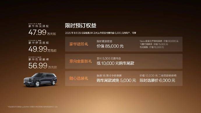 新车目前预计将在9月29日上市,新车此前已经开启了预定,预售通道开启1小时,官方订单量便突破4.2万台,在成都车展上,极氪9X共推出Max版、Ultra版和Hyper版三款配置,预售价格分别为47.99万元、49.99万元和56.99万元。
