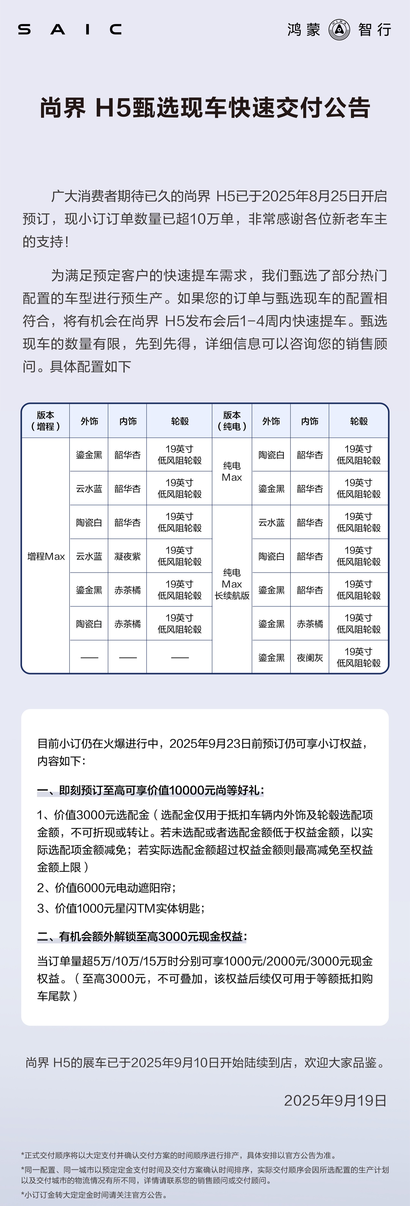 版本(增程)外饰内饰轮毂版本外饰内饰轮毂增程 Max鎏金黑韶华杏19 英寸低风阻轮毂纯电 Max陶瓷白韶华杏19 英寸低风阻轮毂云水蓝韶华杏19 英寸低风阻轮毂鎏金黑韶华杏19 英寸低风阻轮毂陶瓷白韶华杏19 英寸低风阻轮毂纯电 Max 长续航版云水蓝韶华杏19 英寸低风阻轮毂云水蓝凝夜紫19 英寸低风阻轮毂陶瓷白韶华杏19 英寸低风阻轮毂鎏金黑赤茶橘19 英寸低风阻轮毂鎏金黑韶华杏19 英寸低风阻轮毂陶瓷白赤茶橘19 英寸低风阻轮毂鎏金黑赤茶橘19 英寸低风阻轮毂———鎏金黑夜阑灰19 英寸低风阻轮毂据IT之家此前报道,华为、上汽打造的鸿蒙智行“第五界”尚界首车 —— 尚界 H5 在 9 月 19 日小订突破 11 万台,准车主解锁 2000 元专属现金权益,订单量超过 15 万将解锁 3000 元现金权益,新车预售价 16.98 万元起。